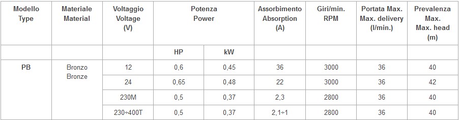Elettropompe periferiche monogiranti in grado di sviluppare pressioni elevate in rapporto a portate limitate. Queste elettropompe trovano largo impiego nel settore nautico dove vengono comunemente usate per il sollevamento di acqua dolce (PB-PCC) o di mare (PB), per il lavaggio di ponti e catene e per la distribuzione di acqua in pressione nei servizi di bordo come: rubinetti, docce, wc, ecc. Tale esercizio diviene automatico con l’utilizzo di piccoli o medi serbatoi autoclave.